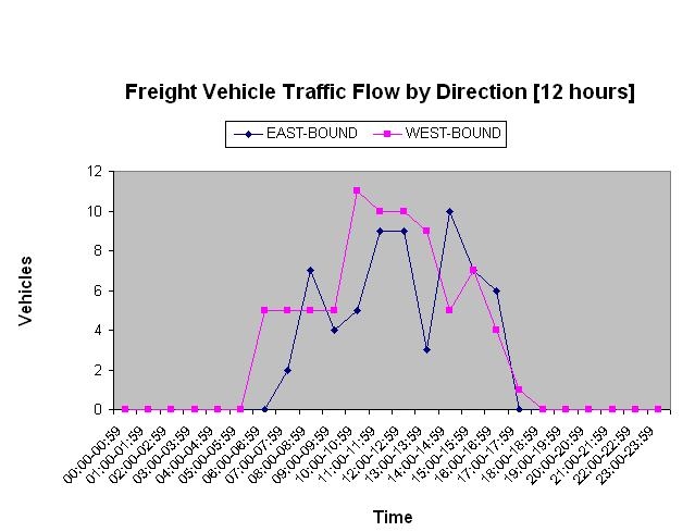 The pattern of freight vehicle movements shows steady flows throughout the day.
